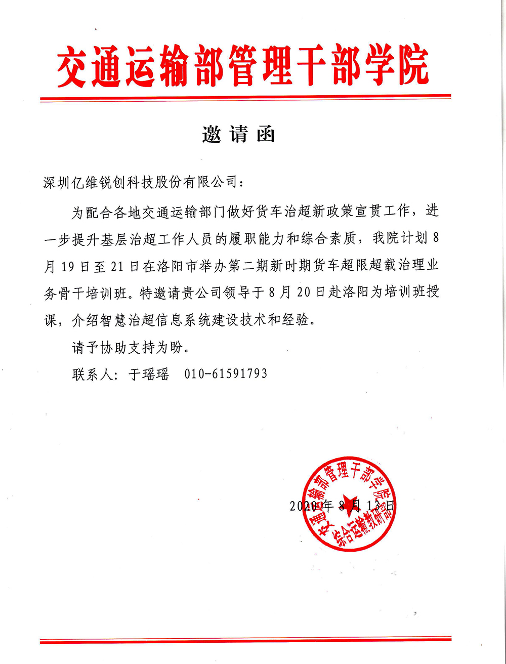 次 2020年8月18至21日,深圳億維銳創(chuàng)科技股份有限公司應(yīng)交通運輸部管理干部學(xué)院邀請到第二期新時期貨運車輛超限超載治理骨干培訓(xùn)班授課。
