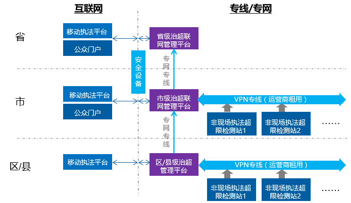 科技治超建設(shè)通常由省級(jí)交通運(yùn)輸管理部門統(tǒng)籌規(guī)劃,市、縣級(jí)分級(jí)部署建設(shè)若干個(gè)非現(xiàn)場(chǎng)執(zhí)法超限檢測(cè)系統(tǒng),通過治超專網(wǎng)(或其他VPN專線)聯(lián)網(wǎng)整合分級(jí)接入到市級(jí)和省級(jí)平臺(tái)。為了實(shí)現(xiàn)在互聯(lián)網(wǎng)環(huán)境的移動(dòng)執(zhí)法平臺(tái)和公眾門戶的接入,需要在兩網(wǎng)設(shè)立安全邊界,以保證網(wǎng)絡(luò)傳輸安全。